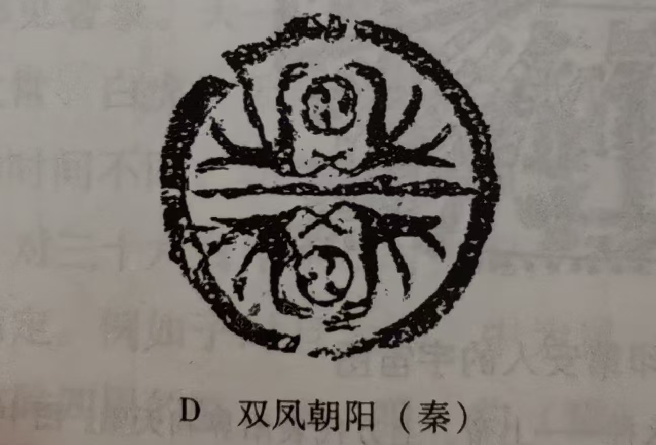 秦汉瓦当。此图显然是双凤朝阳。二鸟之间为火纹,此纹自然是对应于太阳无疑。这样的图式,与河姆渡双鸟朝阳图案一脉相承。(何新《诸神的起源》P18)